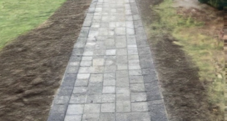 A charming cobblestone walkway winding through a picturesque garden in Brewster, Massachusetts. This classic pathway, made from traditional cobblestones, features a timeless design that adds character and elegance to the outdoor space. The varied shapes and earthy tones of the cobblestones create a textured, visually appealing surface. Flanked by lush greenery and vibrant flowers, the walkway seamlessly integrates with the natural surroundings, offering a welcoming and scenic route through the garden.