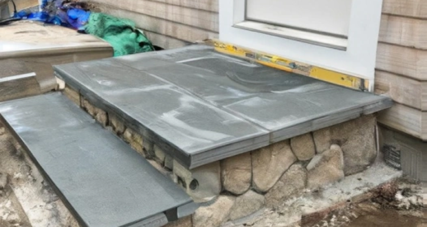 Elegant bluestone steps leading to the front door of a charming home in Dennis, Massachusetts. These meticulously crafted steps are made from high-quality bluestone, known for its durability and timeless beauty. Each step features clean lines and a smooth finish, providing a sturdy and attractive pathway to the entrance. Flanked by lush landscaping and blooming flowers, the bluestone steps seamlessly blend with the natural surroundings, enhancing the home's curb appeal and offering a warm, welcoming approach for guests.